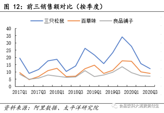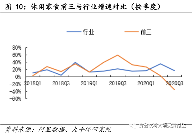 (1)线上分析2020Q3休闲零食前三销售额28.53亿元,同比减少35.83%,低于行业增速51.79pct。龙头增速慢于行业,我们认为与直播带货,新品牌快速崛起有一定关系。