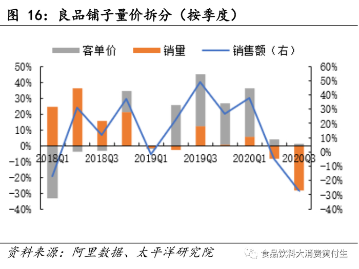 3)良品铺子2020Q3销售额7.15亿元,同比-27.38%,低于行业43.34pct,其中量增-28.38%,客单价增+1.39%,增长主要由客单价贡献;市占率3.67%,同比-2.19pct。