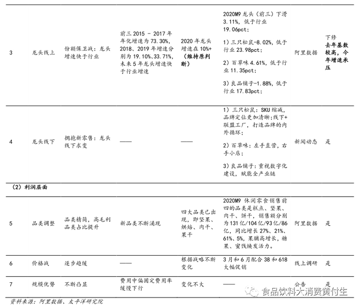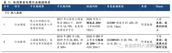 年数据预判上,我们上调休闲零食线上销售额增速(从15%+提升至20%+),下调龙头销售额增速(从年初的20%+下调至10%+),下调龙头集中度预判(从年初的28%+下调为20%+)。