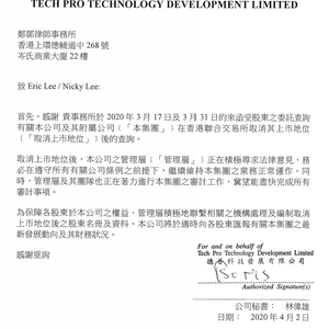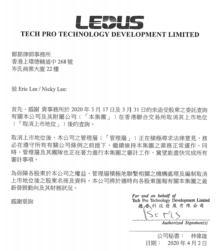 该公司秘书林伟雄在回复信中表示:“取消上市地位后,本公司管理层正在积极寻求法律意见,务必在遵守所有有关公司条例前提下,继续维持本集团业务正常运作。同时,管理层及其团队也正在着力进行本集团审计工作,冀望能尽快完成所有审计事项。”