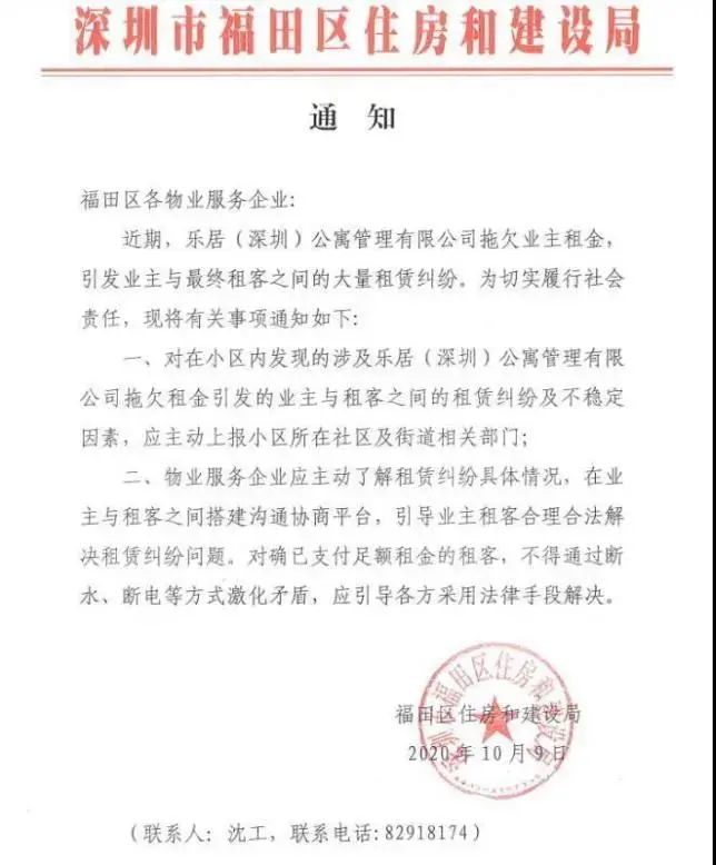 10月份,乐居(深圳)公寓管理有限公司(简称“乐居公寓”)的租客开始陆续收到房东的收房通知,并不断传来乐居公寓卷款跑路的消息。租客余佳告诉记者,房东在10月8日发来微信,称乐居公寓连续两个月未支付房租,现要求由她支付房租,若这个月未收到租金,将强制收房。