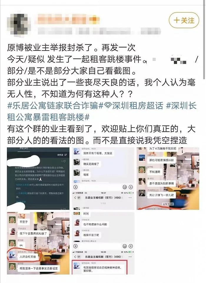有租客在微博上放出疑似乐居公寓业主们的维权群聊天记录,里面有个别业主对疑似自杀租客发表了过激言论,同时有业主表示想停水停电、换锁,逼租客退租。