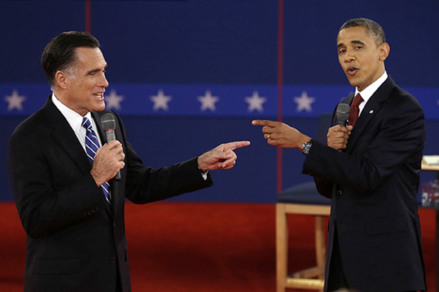 2012年10月16日,奥巴马(右)在总统候选人辩论会上。