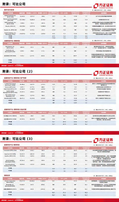 采用SOTP估值法:我们对比海内外金融科技公司,将蚂蚁集团的支付、微贷、保险、理财、数据库等业务进行分部估值并加总,计算出蚂蚁集团的估值为3800亿美元。