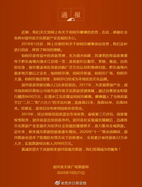 据新京报报道,10月21日,剑河县文体广电旅游局旅游办一名工作人员告诉新京报记者,仰阿莎雕塑旅游项目的开发,是由剑河县仰阿莎旅投公司负责,没有使用国家扶贫资金和国家财政拨款,“没有用国家的一分钱。”