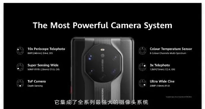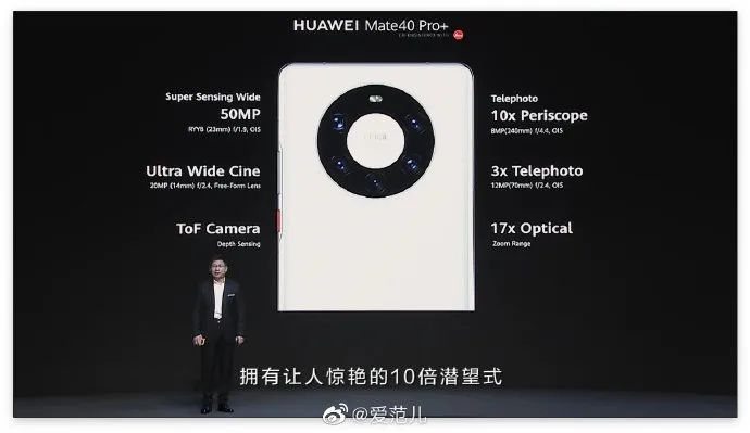 其中,华为 Mate 40 Pro+ 配备了一枚 10 倍光学变焦、20 倍混合变焦、最大 100 倍数字变焦的潜望式镜头。同时配合 5000 万像素(23mm f/1.9)主摄,2000 万像素超广角,1200 万像素 3 倍光学长焦,ToF 相机组成五摄配置。