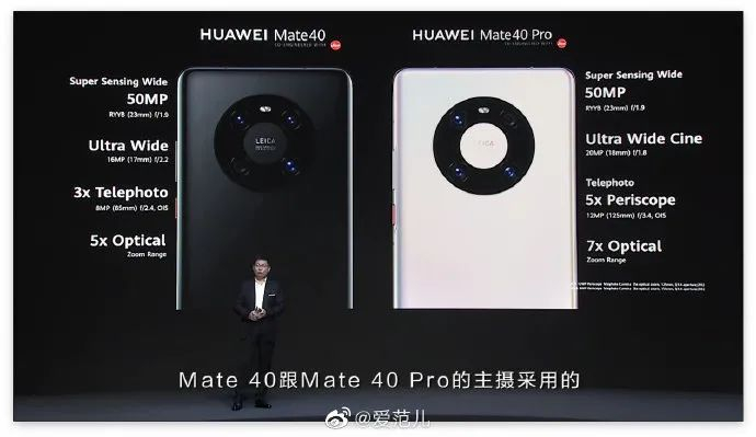 华为 Mate 40 Pro 和 华为 Mate 40 的四摄配置相近,均搭载了 5000 万像素大底主摄,但长焦和超广角部分均有一定的参数差异。