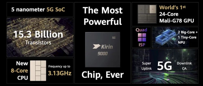 核心硬件部分最大的看点来自于麒麟9000处理器。这个华为全新设计的移动处理器采用了台积电5nm EUV的工艺打造,集成5G基带,共有八个核心。华为官方给出的数据,这颗处理器的晶体管数量比苹果的A14多了30%。