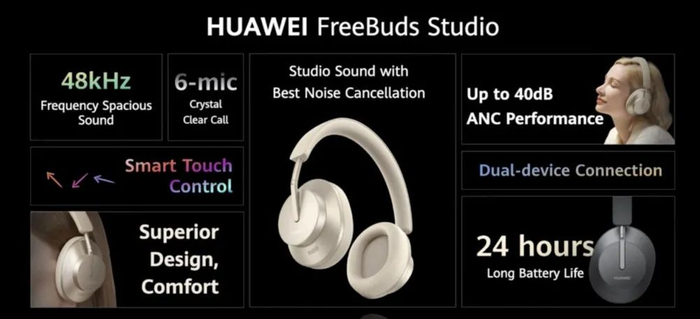 耳机产品线也更新了,传闻已久的头戴式耳机正式亮相,定名FreeBuds Studio。这款头戴式的耳机拥有黑色和棕色两种配色,拥有主动降噪技术,内置的声学器件带来了高达4Hz-48kHz超频宽声音范围。