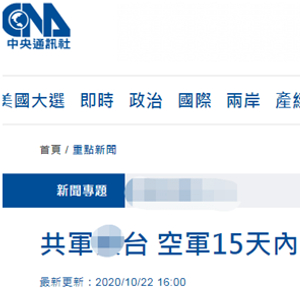 台湾“中央社”报道声称,共军近期对台湾“文攻武吓”,不仅频繁“侵犯”台湾“防空识别区”,也不时逾越台湾“海峡中线”,根据台防务部门“实时军事动态”专区刊载,自9月16日起截至10月21日,共军已第22度“扰台”。