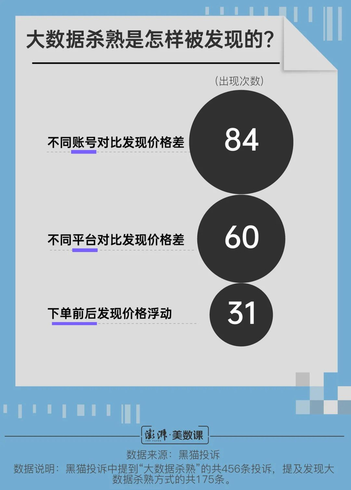 但当几个人聚在一起比对价格时,平台就露了马脚。在提及发现方式的投诉样本中,通过对比不同账号的价格差而找到“大数据杀熟”证据的,占到近一半。