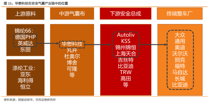 与上游合作密切,供应集中但不完全依赖任一厂商。公司的原材料主要是安全气囊用丝锦纶66,该产品的断裂伸长大、弹性好,但供应相对集中,能够专业生产该种工业丝且通过国内整车厂商认证的仅少数几家化学纤维企业,包括博列麦神马、德国PHP、英威达、日本东丽等。公司与德国PHP、博列麦神马、英威达均建立了良好合作关系,产品供应稳定。