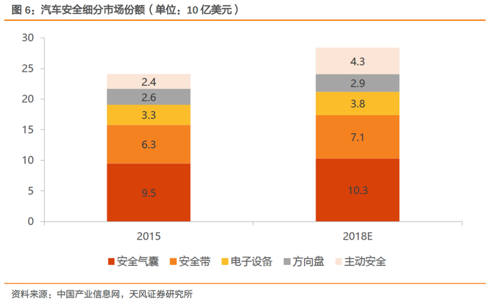 被动安全是发生交通事故时乘客和驾驶员最后的救命稻草,市场规模大。汽车安全系统通常分为两种:主动安全系统和被动安全系统。这两者的侧重点不同,前者的作用是预防交通安全事故的发生,包括ABS防抱死系统,智能驾驶等。后者则是在发生交通安全事故时保证车内人员的安全,包括安全带,安全气囊,行人保护等。