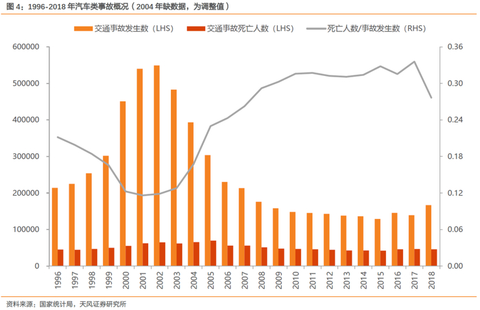 汽车类交通事故死亡人数/事故发生数的比例自2002年来增加较多,这说明交通事故的事后防护做的并不够,其中安全气囊是事后防护的重要的一环,安全气囊单独使用可以减少18%的死亡率,而与安全带配合使用时可以减少47%的死亡率。