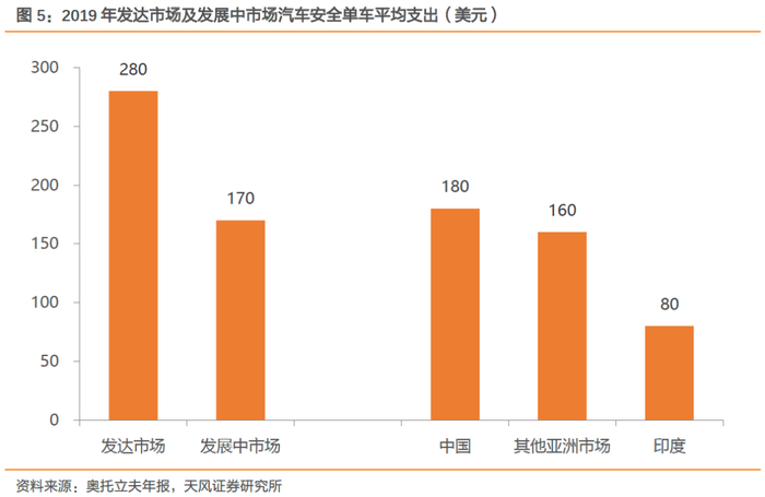 我国汽车安全市场规模稳定增长。全球不同地区汽车安全配置价值差异较大,根据autoliv的测算,发达市场平均水平为280美元/辆,发展中国家平均水平为170美元/辆,其中中国为180美元/辆,远低于发达国家水平,反映了我国汽车安全市场还存在较大的增长空间。