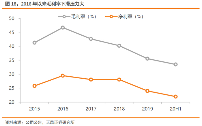 毛利率近年下滑压力偏大,车市复苏有望带动毛利好转。公司2016年毛利率为46.8%,此后先后受到锦纶长丝与涤纶长丝等原材料价格上涨,上游石油价格大幅上升,人工和折旧费用增加等影响,毛利率逐年下降,2019年跌至35.6%,20H1为33.5%。2020年二季度开始,汽车行业市场逐步回暖,公司Q2毛利率同比提高4.2个百分比至36.5%,未来随着行业的进一步复苏,毛利率有望逐步恢复。