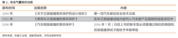 但值得注意的是,国内还并没有汽车安全气囊的强制性法规。(据中国产业信息网发布的报告,2013年我国安全气囊的配备率为62%,依然还有仅40%左右的车没有配备安全气囊,但在大多数国家都有强制安装的要求,早在上世纪90年代初美国通过一项联邦《综合地面运输及效率法案》,要求1998年9月1日起生产的乘用车和轻卡必须安装主驾驶和副驾驶的前安全气囊,而到了2013年,规定在美销售的所有车辆必须安装侧安全气囊。)我我们认为强制安装安全气囊是大概率趋势,届时,国内安全气囊的市场将进一步扩大。