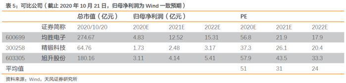 我们预计公司20-22年的归母净利润分别为2.4亿、2.6亿和3.1亿,对应PE分别为26倍、24倍和20倍。选取均胜电子、精锻科技、旭升股份作为可比公司,22年的平均PE为24倍。给予公司22年24倍目标PE,对应目标价24.00元,首次覆盖给予“买入”评级。