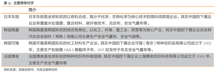 公司目前的主要竞争对手有日本东丽、日本帝人、日本东洋纺、韩国可隆、韩国杜奥尔、法国博舍工业集团等在华投资设立的实体。虽然市场竞争日益激烈,但公司通过加大市场开拓、开发高端产品等措施使得公司竞争力不断增强。
