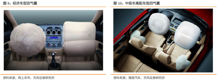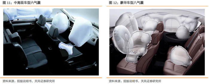 单车安全气囊数逐步增加,行业空间稳中有升。随着人们安全意识的不断加强,单车配备安全气囊的个数也在不断增加。从最开始的单车只安装一个主驾安全气囊,到开始为副驾配置安全气囊。随着安全气囊的重要性日益凸显,如今六个安全气囊成为中高级车型标配,甚至很多车型安装了8个安全气囊。