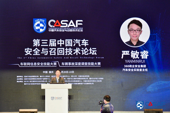 2020年10月20日-22日,由国家市场监督管理总局缺陷产品管理中心、浙江清华长三角研究院、中国汽车工程研究院股份有限公司、重庆市合川区人民政府联合主办的第三届中国汽车安全与召回技术论坛在重庆隆重召开。本届论坛以“智能新能源汽车全产业链安全与技术创新”为主题,汇聚120家政府机构、事业单位、科研院所以及整车和零部件企业等行业翘楚权威论道。其中,在10月21日举办的“智能汽车产业链安全与技术创新”专题论坛上,360 政企安全集团汽车安全实验室主任严敏睿发表了核心为《智能网联汽车信息安全风险与解决之道》的精彩演讲。以下内容为现场演讲实录: