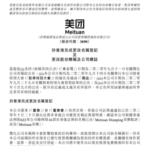 公司股份于联交所进行买卖的中文股份简称将由“美团点评 -W”更改为“美团-W”,自2020年10月29日上午九时正起生效。公司股份于联交所进行买卖的英文股份简称“MEITUAN-W”将维持不变。股份代号“3690”将维持不变。
