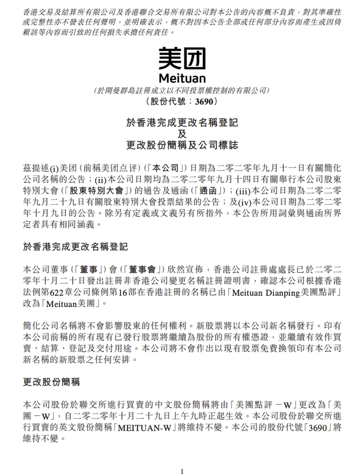 22日晚间,美团点评在港交所发布公告称,香港公司注册处处长已于2020年10月20日发出注册非香港公司变更名称注册证明书,确认本公司根据香港法例第622章公司条例第16部在香港注册的名称已由‘Meituan Dianping美团点评’改为‘Meituan美团’。