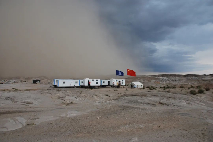30年来,北山的营地换了许多次,钻孔就打了近100 口,但是每一次在一片戈壁扎下帐篷或寝车,王驹都坚持让大家在驻地先竖起一面国旗。