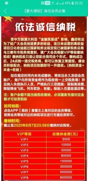 正在李兵沉浸于利润逐日上涨中时,8月6日,该APP平台突然在主页发布了一则“依法诚信纳税”的通知。通知称:鑫岳牧业连日来运营的高收益项目日化收益超过国家税务法规定,现已被国家税务总局乌兰察布市税务局查到,请广大会员根据VIP等级缴纳税收!缴纳税收只是让您配合我司走个形式,缴纳成功后,24点统一提交税务局,即可以恢复正常提现。