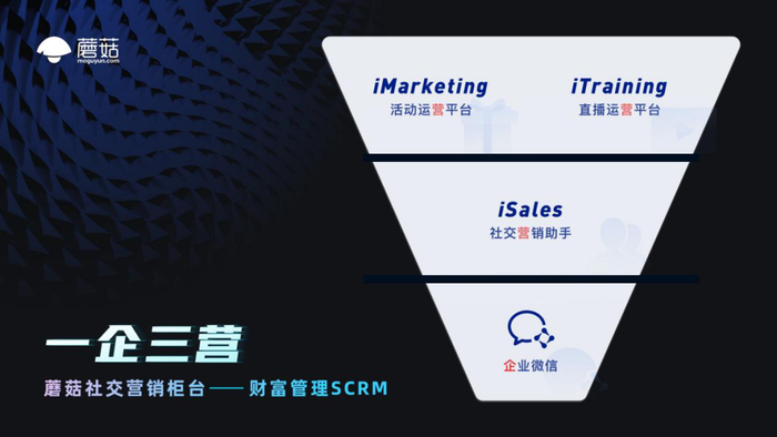 据了解,依托于企业微信,蘑菇推出的是“一企三营”一体化解决方案,在企业微信SCRM解决方案中,将全面升级社交营销助手(iSales)、活动运用平台(iMarketing)和直播运用平台(iTraining)。