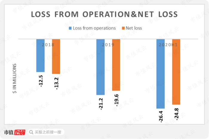 2020年上半年,营业亏损和净亏损分别为2640万美元和2480万美元,亏损额均已经超过2019全年。