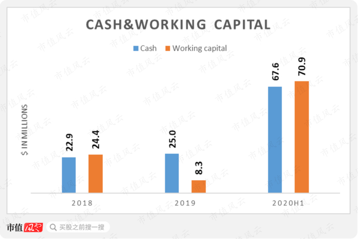 得益于现金的大幅增长,公司营运资金(定义为“流动资产总额减去流动负债总额”)也在2020年上半年达到历史高位的7090万美元。