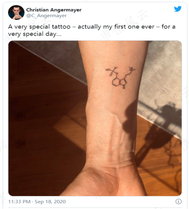 (Angermayer在公司IPO后发布的裸盖菇素分子结构纹身照片)