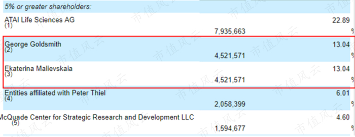 Malievskaia博士和Goldsmith均为公司持股5%以上的大股东,IPO后两人各占公司13.04%的股权。两人合计的股权达到26.08%,已经超过持股22.89%的ATAL生命科学。