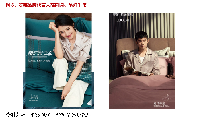 对于罗莱品牌来说,由于其多年来市场第一家纺品牌的形象已经深入人心,其在线上拥有大量的自然搜索流量,因此其品牌打法更多基于品牌势能进行高举高打:(1)精耕产品,重点打造具有标签化的品牌系列,沉淀品牌风格和视觉元素;(2)在已有强大自然流量的基础上,继续从新渠道寻找新流量,例如通过高圆圆、易烊千玺等代言人和头部KOL达人矩阵在完成当日千万直播销售的同时进一步加固品牌在消费者心中中高端、“超柔床品”的形象。(3)罗莱单价及品牌力的提升在加强自身销售的同时,也为LOVO做出了很好的背书。