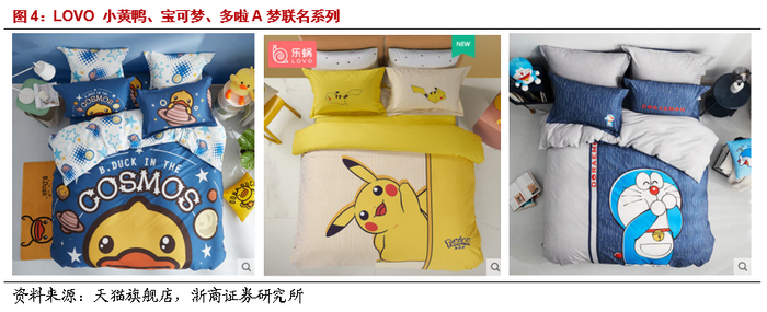 LOVO由于更多定位在年轻消费者,其在打法上则显得更多元。(1)产品上,在“注重时尚颜值、创新小惊喜、极致性价比”上持续提升,并不断与IP形象跨界合作、IP各系列产品增速迅猛;(2)直播渠道上,LOVO与辛巴、薇娅、李佳琦等主播不断加强合作(与辛巴合作曾经创下过单场5000万GMV的记录),同时由于其品牌相对大众的定位,直播中相对较大力度的打折也能够满足其目标消费客群的需要。(3)同时由于背靠罗莱集团,无论是渠道还是主播均对其供应链和产品品质有较强的信心,因此在选择家纺合作品类时均会将LOVO作为首选标的之一。