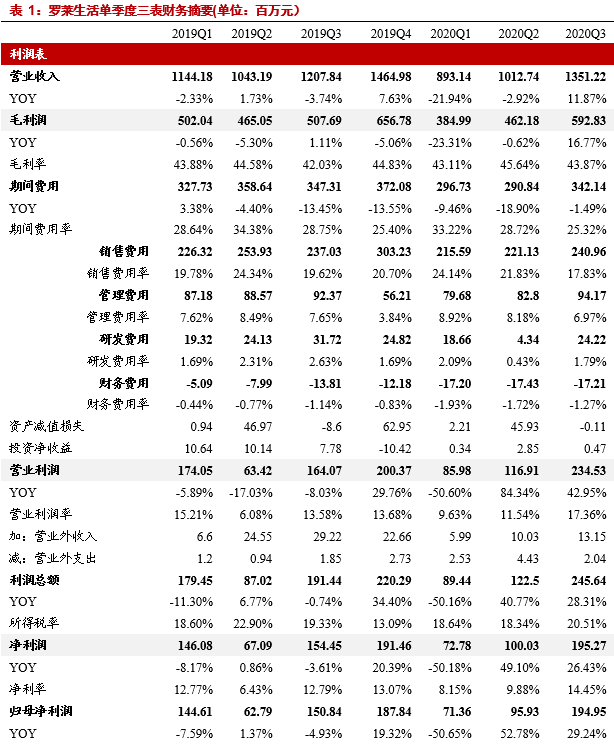 内部组织架构理顺助力提效,单季度扣非利润高增45%。Q3单季度收入高增同时线上业务毛利率的提升(主要来自罗莱和LOVO两个品牌定价的稳定性和折扣的把控)带动公司整体毛利率提升1.8pp至43.9%,由此单季度毛利润同比增长17%至5.9亿元,叠加今年年初组织架构理顺、内部效率提升,Q3期间费用同比去年下降1.5%至3.4亿元,由此带动营业利润大幅提升43%至2.3亿元,扣非归母净利增长45%至1.9亿元。