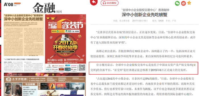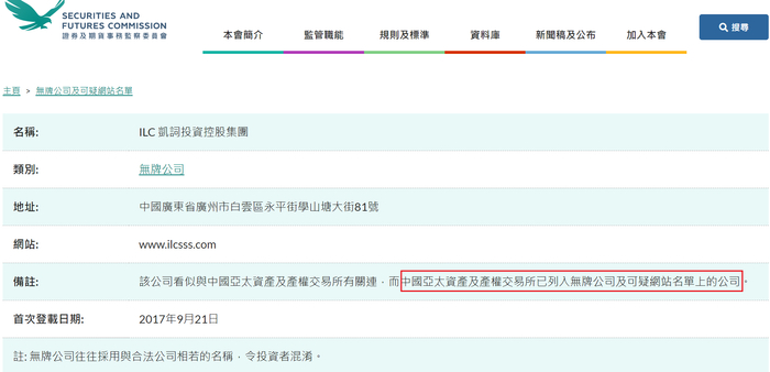 财联社记者注意到,2017年3月,多家媒体报道全球中小企业股权交易中心在港成立,报道中提到,该交易中心是依托于中国亚太资产及产权交易所(简称“亚太所”)。不过值得一提的是,2017年9月,香港证监会官网的一则信息显示,中国亚太资产及产权交易所已被列入无牌公司及可疑网站名单上的公司。