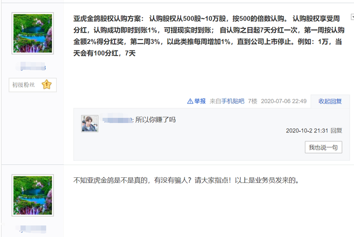 对于网络上流传的“股权认购方案以及分红方案”,王汝聪回应称:“亚虎金鸽的运营是一种因应疫情时代的科技金融创新,在传播中被曲解。上述科技金融创新是一个类似众筹金融体系创新,来缓解疫情期间的消费低迷和资金压力,把地摊经济和网格化商业发展融为一体。亚虎金鸽是以生物科技为主体的实业和互联网运营的融合。”