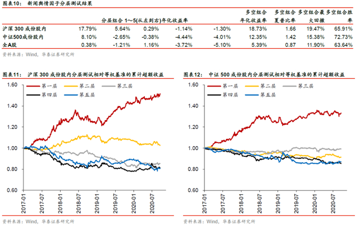 图表10~图表12展示了新闻舆情因子的分层测试结果。可知新闻舆情因子在沪深300成分股内表现最好,在中证500成分股内表现次之,在全A股内则表现最差。在沪深300成分股内因子多头的表现也不太稳定,2018年出现了持续的回撤。