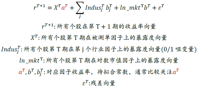 回归法是一种最常用的测试因子有效性的方法,具体做法是将第T期的因子暴露度向量与T+1期的股票收益向量进行线性回归,所得到的回归系数即为因子在期的因子收益率,同时还能得到该因子收益率在本期回归中的显著度水平——t值。在某截面期上的个股的因子暴露度(Factor Exposure)即指当前时刻个股在该因子上的因子值。第T期的回归模型具体表达式如下。