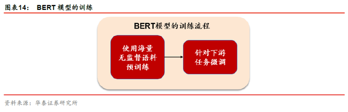 2018年,Google在论文“BERT: Pre-training of Deep Bidirectional Transformers for Language Understanding”中提出了自然语言预训练模型BERT。如图表14所示,BERT模型的训练主要包含两步: