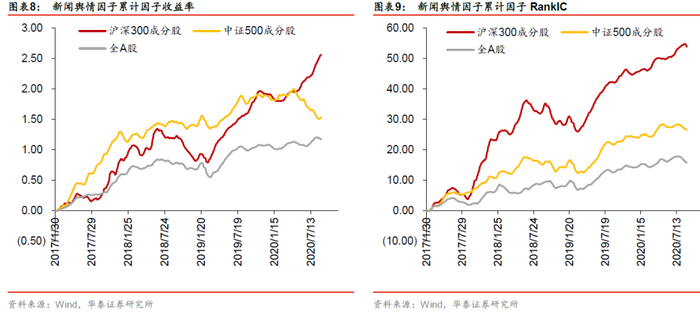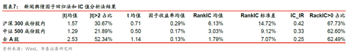 图表7~图表9展示了新闻舆情因子的回归法和IC值分析法结果。可知新闻舆情因子在沪深300成分股内表现最好,在中证500成分股内表现次之,在全A股内则表现最差。