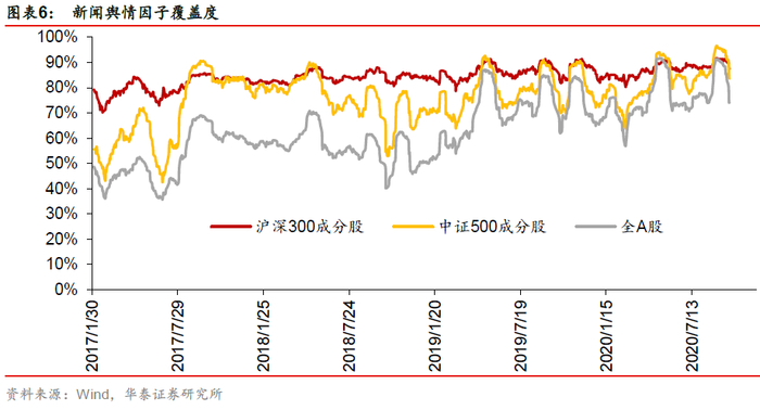 图表6展示了各成分股中新闻舆情因子的覆盖度,可见沪深300成分股内覆盖度最高,且随着时间的推移,各成分股的因子覆盖度也在逐渐上升。