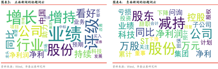 我们将2017年以来的新闻的标题进行分词并统计词频。图表3和图表4分别为正面新闻和负面新闻的标题词云(词云中字体越大说明词频越高)。正面新闻的标题中,“增长”、“增持”、“看好”、“改善”、“中标”等词出现次数较多。负面新闻的标题中,“减持”、“亏损”、“问询”、“辞职”、“担保”等词出现次数较多。