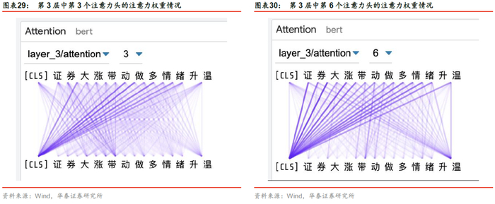 BERT模型结构复杂且参数量庞大,本文借助Google发布的开源NLP模型可解释性工具LIT来打开BERT的黑箱,理解BERT的“思考过程”。LIT有两个重要模块:(1) Salience Maps模块,可分析输入文本中每个字符对于模型预测结果的重要性。例句中的结果显示,正面情感新闻中“同比预增”、“中标”等字符重要性较高,负面情感新闻中“风控”、“摘牌”、“减持”等字符重要性较高。说明BERT都能够较好地抓住文本中的关键词,从而做出较为准确的预测。(2) Attention模块,可分析注意力权重,从而帮助理解BERT的学习机制。