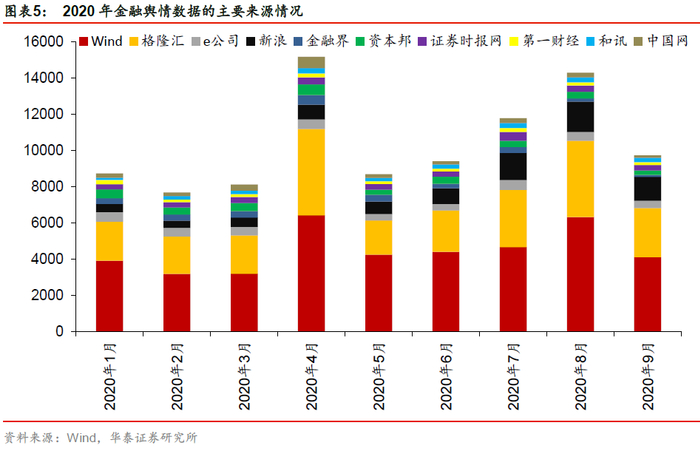 图表5为2020年金融舆情数据的主要来源情况,Wind和格隆汇为最主要的来源。