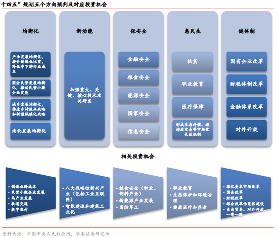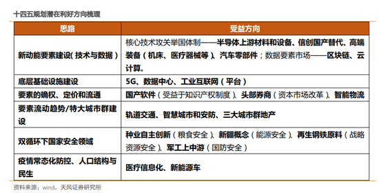 天风证券认为,展望十四五,需要重视几个关键词:十九大提出高质量发展(淡化总量,重视结构);十九届四中提出“核心技术攻关举国体制”,将“社会主义市场经济体制”上升为基本经济制度;今年4月发布要素市场化顶层文件,5月以来多次在重磅会议上提双循环概念。建议关注以下潜在利好方向: