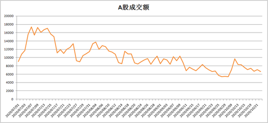 节后A股持续缩量震荡,数据显示,自A股自7月中以来成交量逐步下滑,上一次两市成交额突破万亿在9月9日,国庆前两市成交额一度跌至6000亿下方,虽然节后市场交易量有所活跃,但在10月12日冲击9700亿元以后,市场成交额再度下滑,滑至节后的低点。