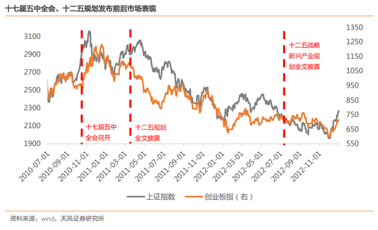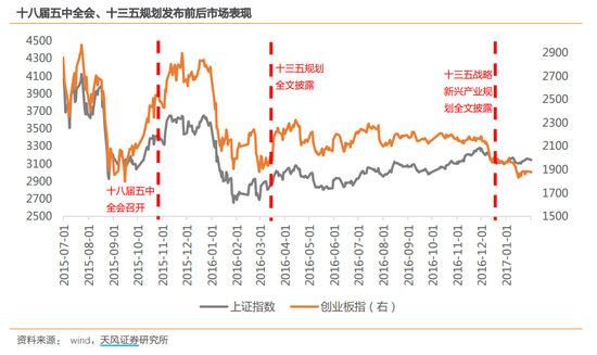 天风证券认为,十二五和十三五规划发布前后市场情绪都有所提振,但由于两次都处于弱市中,因此持续性不强。两次战略新兴产业规划发布之后市场表现都比较低迷,一方面与当时的市场环境有关,另一方面也与市场预期、利好兑现有关,5G、新材料等都在战略规划发布前提前反映。